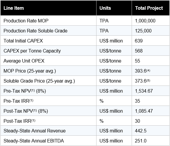 - Total production of 1,000,000 tonnes per annum (TPA) of K62 granular-grade Muriate of Potash (MOP) and 125,000 TPA of K62 soluble grade MOP