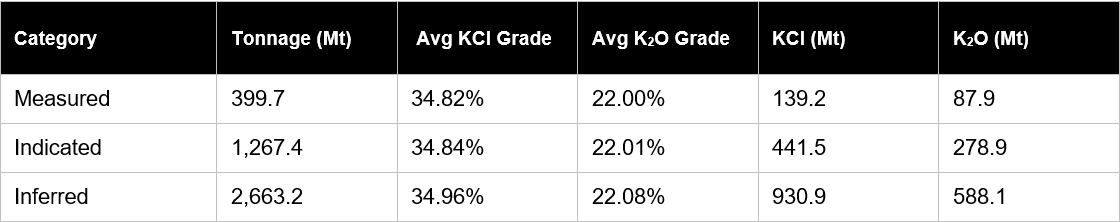 - Measured and indicated tonnage of 1,671.5 million metric tonnes at an average grade of 34.8% KCl, yielding 582 million tonnes of KCl