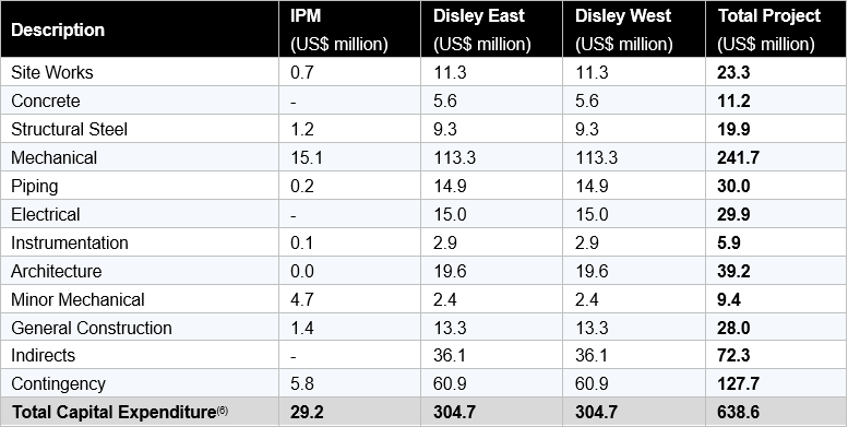 Mechanical equipment represents the largest component of initial capital expenditure at approximately 38% of Total Project initial CAPEX. For Disley East and Disley West, the mechanical scope encompasses the full processing train required to produce export-grade granular MOP, including crystallization, debrining and drying, compaction and glazing, soluble product screening, and product storage and loading. For the IPM, the mechanical scope includes a crystallizer, pumps, tanks, pipework, centrifuge, dryer, and baghouse. Total initial capital expenditure across all three facilities is US$639 million, as summarized in the table below.