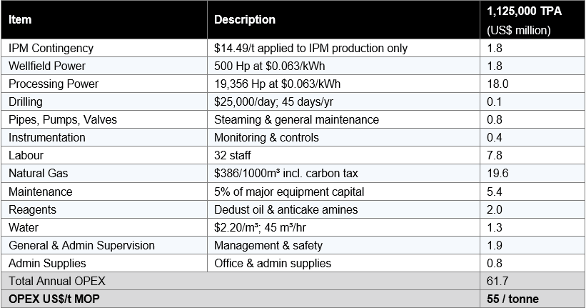 - In addition to MOP, the IPM will produce 50,000 m³ per year of KCl brine that may be attractive to regional oilfield services customers at an average transport cost of US$10/m³;