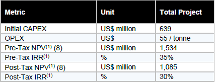 - US$639M initial CAPEX estimate, including US$128M in contingency
